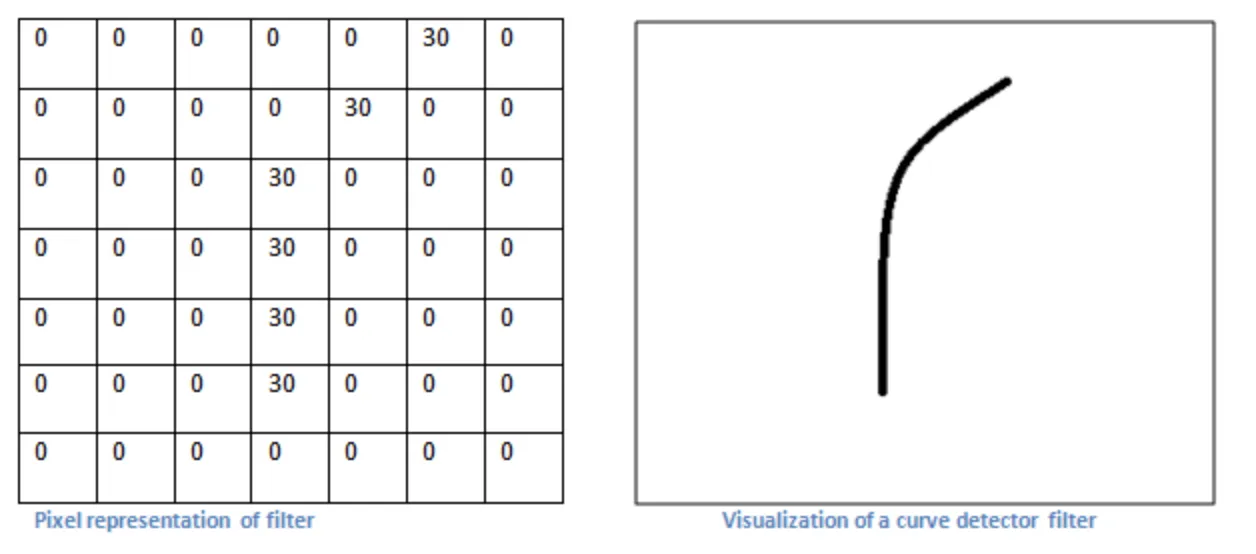 Each filter can be viewed as a feature identifier. The features are some simple characteristics all the images have in common such as straight borders, simple colors, various curves, etc. Our first filter will be a 7 x 7 curve detector.