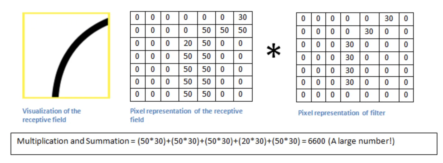 So, in the upper left corner, the value of the feature map would be 6600. This high value indicates that the filter has seen some shape similar to the filter's curve. In the upper right corner, the value of the feature map will be 0 because there was no similar curve in this area.