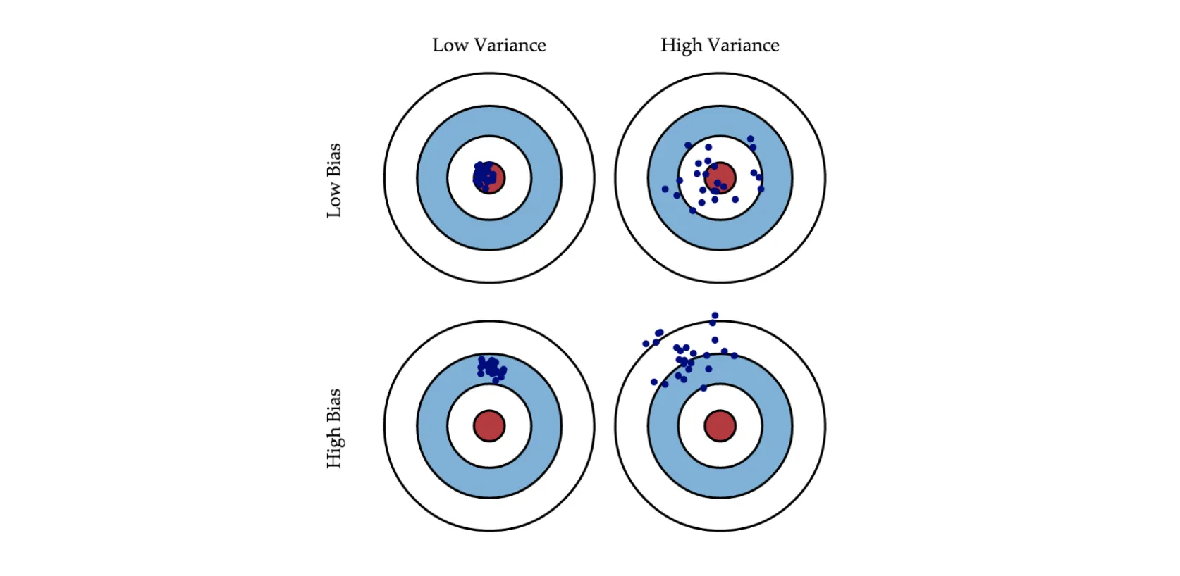 The picture above shows models with different biases and variances. A blue dot represents each model, so one dot corresponds to one model trained on one of the possible training sets. Each circle characterizes the quality of the model - the closer to the center, the fewer the model's error on the test set.