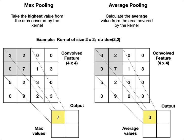 With its philosophy, Average Pooling blurs and smooths out the feature map’s details. You can view it from two different perspectives.