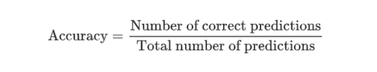 Fortunately, Accuracy is a highly intuitive metric, so you should not experience any challenges in understanding it. The Accuracy score is calculated by dividing the number of correct predictions by the total prediction number.