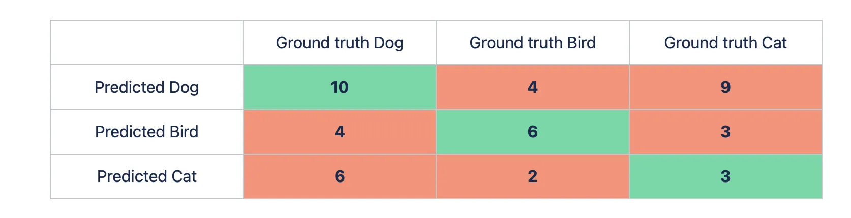 • Micro Precision score: (TP Dog + TP Bird + TP Cat) / ((TP + FP) Dog + (TP + FP) Bird + (TP + FP) Cat) = (10 + 6 + 3) / ((4 + 9 + 10) + (4 + 3 + 6) + (6 + 2 + 3)) ~ 0.4