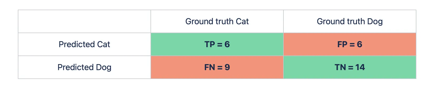 Let’s say we have a binary Classification task. For example, you are trying to determine whether a cat or a dog is on an image. You have a model and want to evaluate its performance using Recall. You pass 15 pictures with a cat and 20 images with a dog to the model. From the given 15 cat images, the algorithm predicts 9 pictures as the dog ones, and from the 20 dog images - 6 pictures as the cat ones. Let’s build a Confusion matrix first (you can check the detailed calculation on the Confusion matrix page).