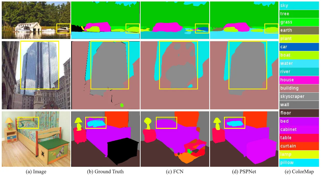 From the figure above we see that there are several issues with complex-scene parsing. The first row shows the issue of mismatched relationships – cars are seldom over water than boats. The second row shows confusion categories where the class “building” is easily confused with “skyscraper”. The third row illustrates inconspicuous classes. In terms of color and texture, the pillow in this case is extremely comparable to the bedsheet. These inconspicuous objects are easily misclassified by Fully Convolutional Network (FCN).