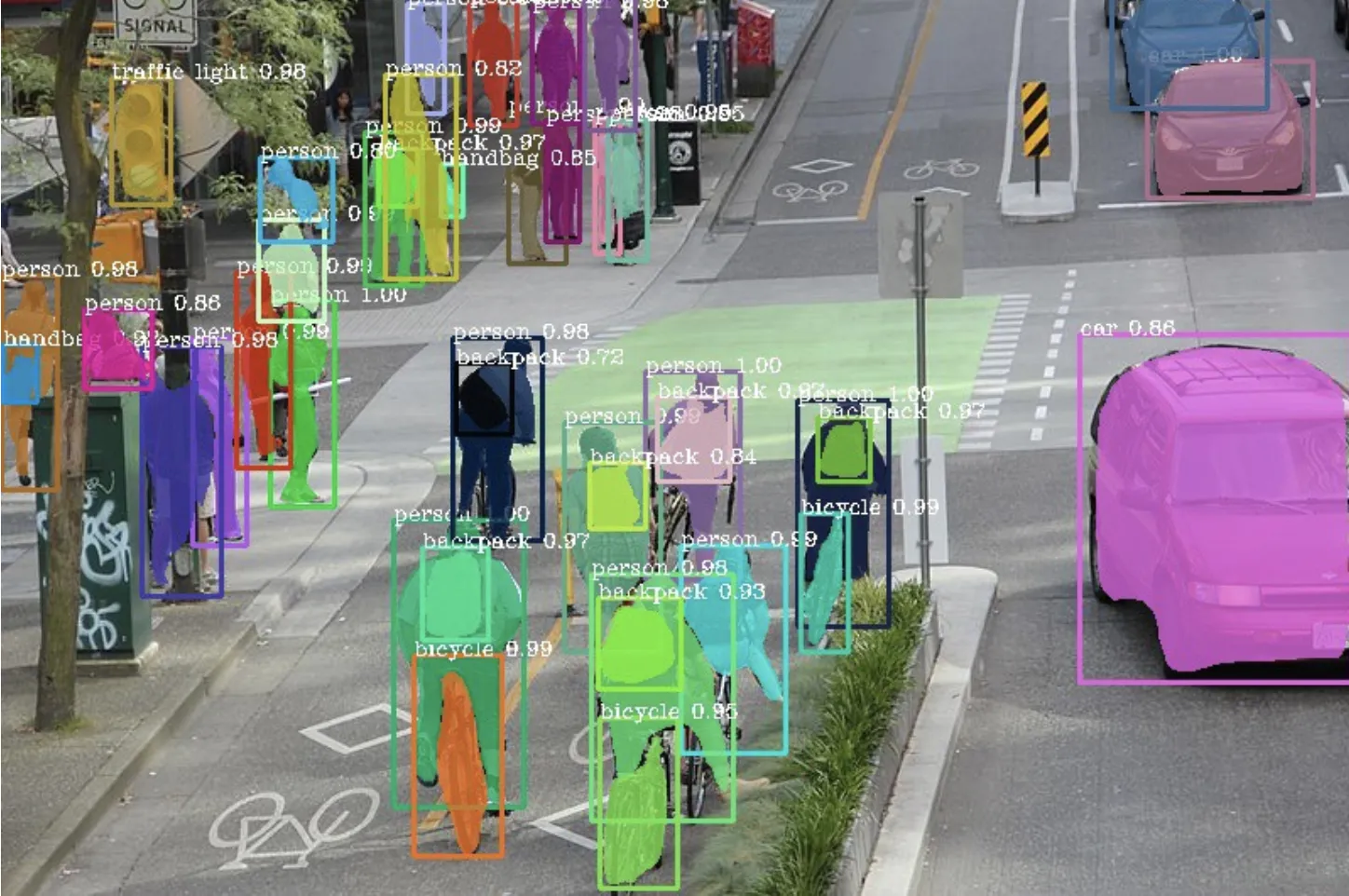 As a combination, you get Instance Segmentation that detects all distinct objects in an image, segments them, produces a pixel-perfect segmentation mask for each object, and classifies them. Here is a simple example of how an Instance Segmentation model output might look like: