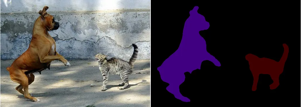 Semantic Segmentation classifies every pixel on an image, so all instances of the same category share the same class label. As a result, you get a segmentation map.