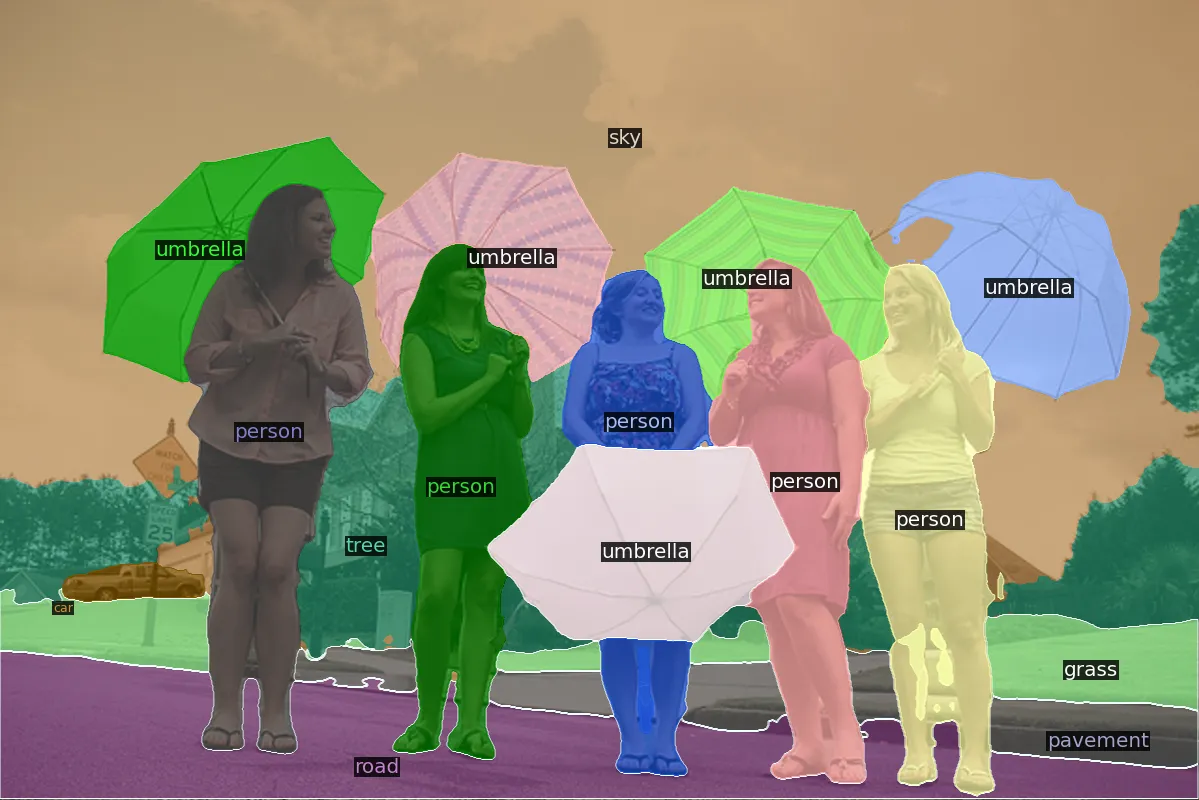 You predefine some semantic (for example, ‘sky’, ‘road’, and ‘grass’) and instance target classes (for example, ‘person’ and ‘umbrella’). Please note that as in any Semantic Segmentation task, in Panoptic Segmentation, there is a default ‘background’ class that is used to mark all the space that does not correspond to any other category;