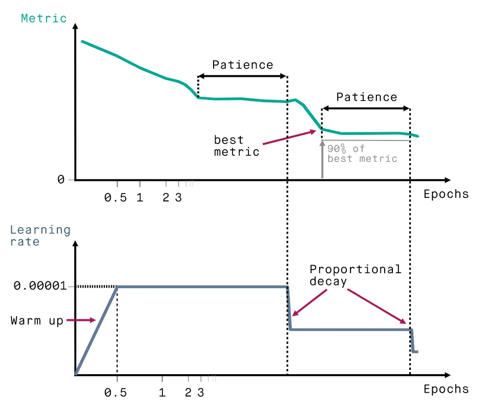 - Cooldown - the number of epochs the algorithm would wait after the learning rate reduction before resuming normal operations (monitoring for improvements, calculating patience, and so on.)
