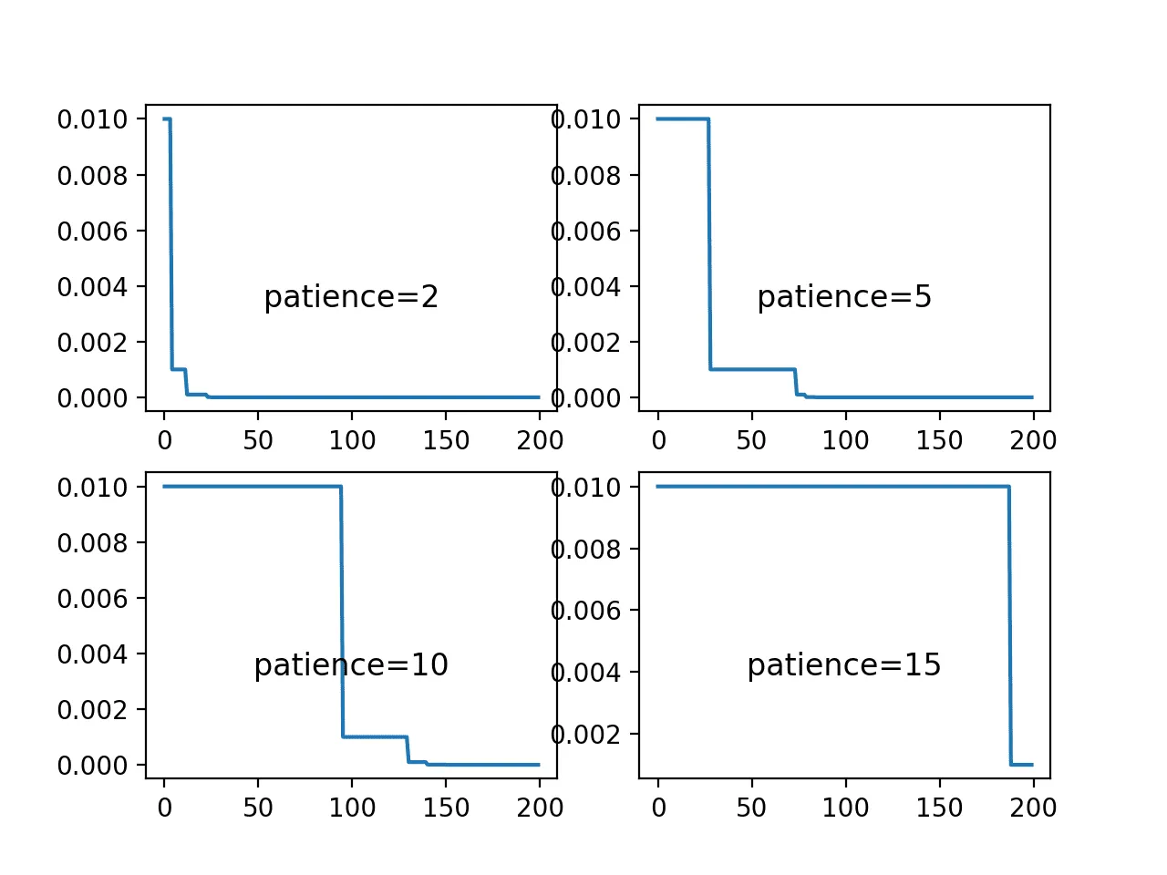 - Patience - the number of epochs with no improvement, after which the learning rate is reduced. If the patience is 10, the algorithm ignores the first 10 epochs with no improvement in the quantity and reduces the learning rate in the 11th epoch.