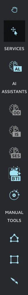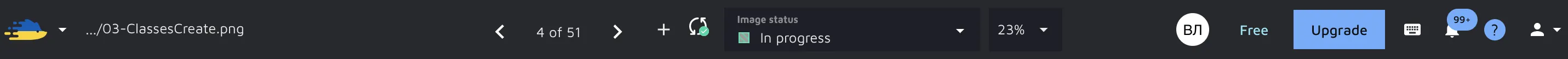 At the top of the interface, you can find the navigation bar. Here, you can navigate between images, access the project menu, and change the image’s status, as well as accessing various menus. To go to another image, click the arrows. To change the image status, click on the current image status to access a drop-down menu, in which you can specify a new status.