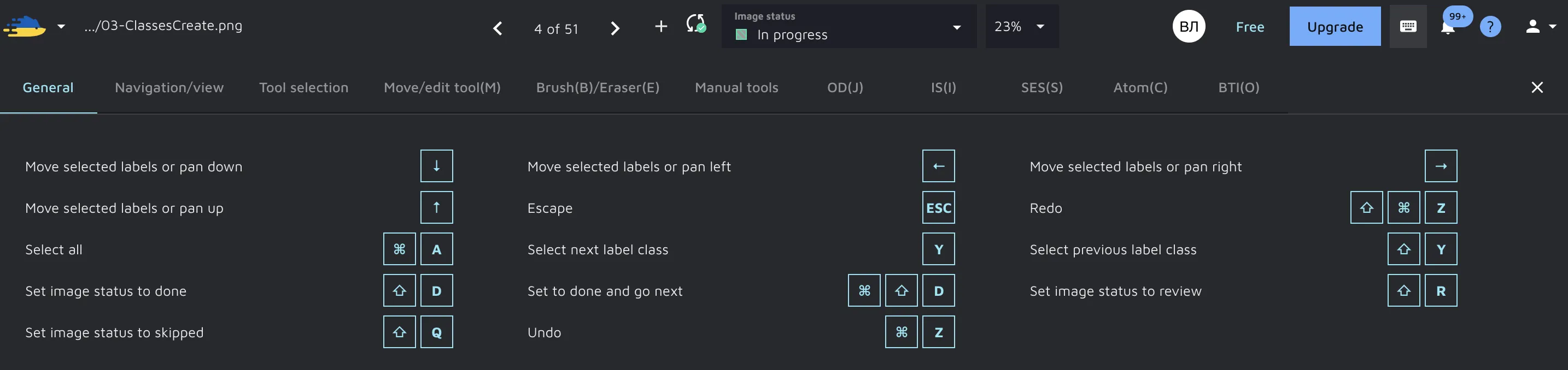 To access the hotkeys guidance, please click on the keyboard icon. You will see a comprehensive list of various hotkeys split into logic groups.