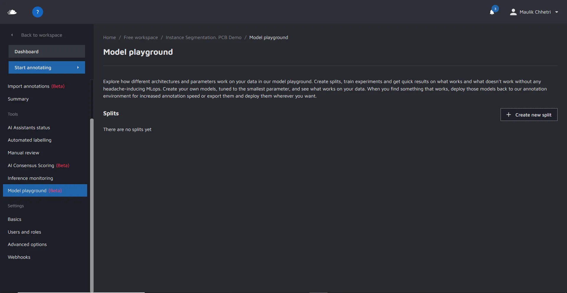 Here you can create data splits. by clicking on "Create new split"