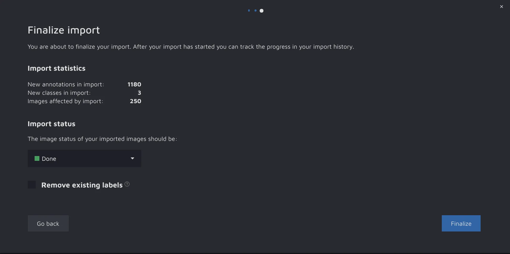 On this final screen, you will see the summary of what you are about to import again. More importantly, you will be able to specify which status the images affected by the imported annotations should have.