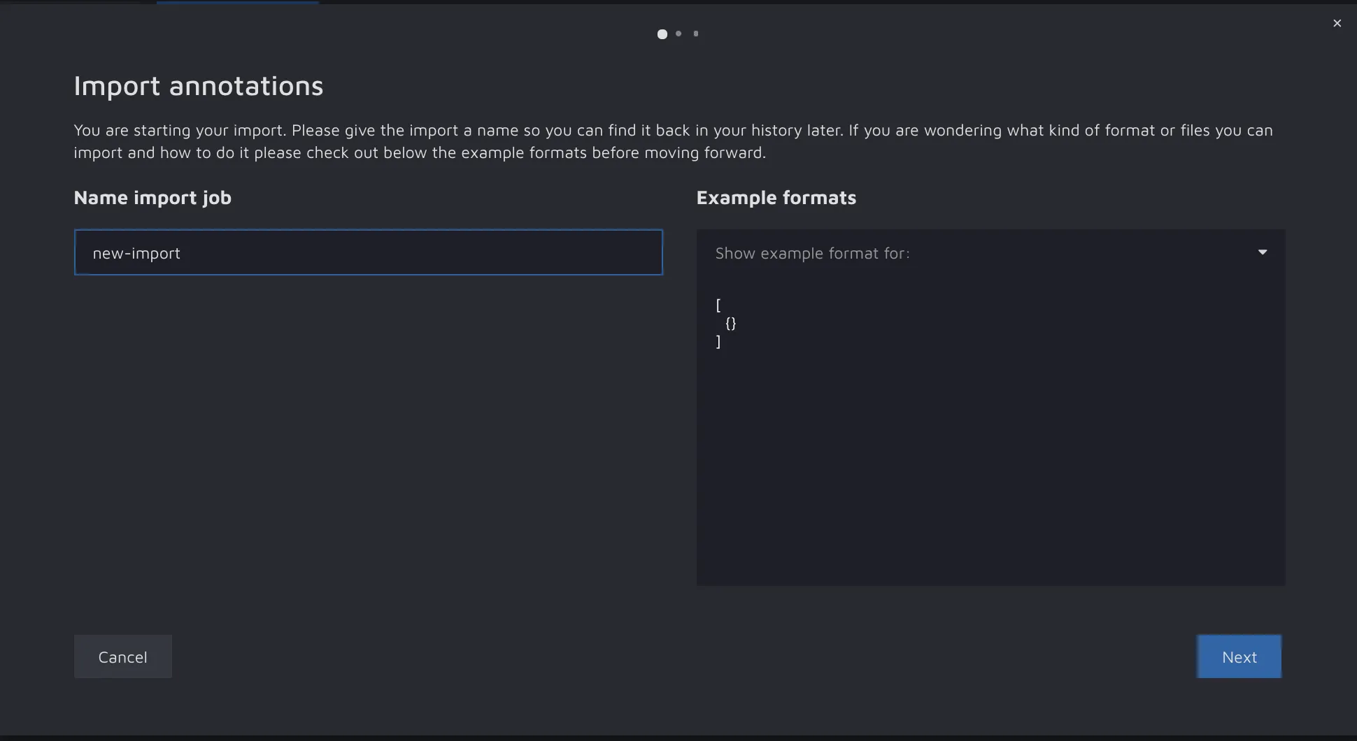 Here, you can upload annotations that you already have created in other annotation tools, or from other Hasty projects. To start, click the "New import" button. This will open the "Import" modal.