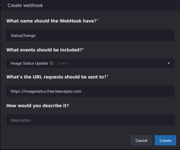 In our example, the Webhook is called "StatusChange," and the triggering event is the "Image Status Update."