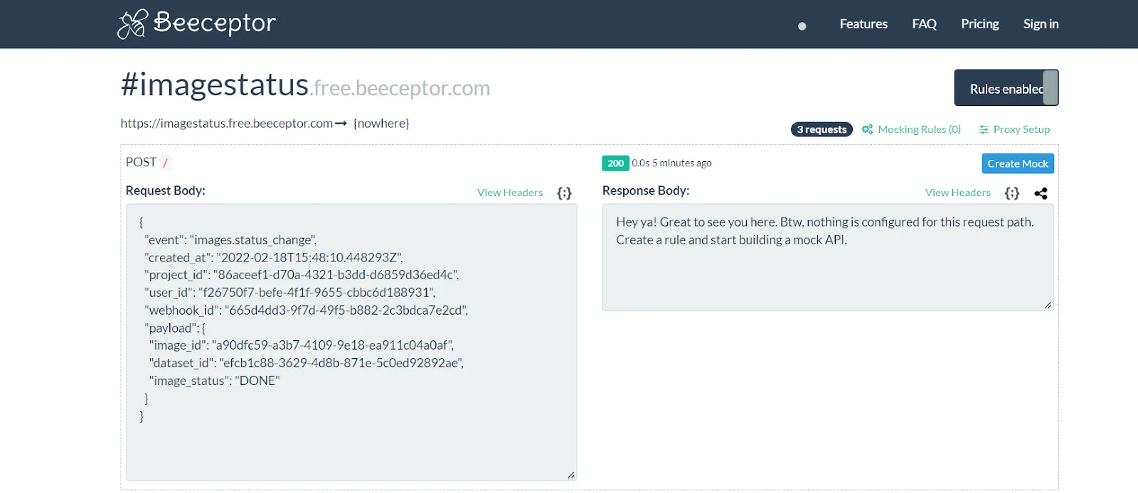 As mentioned earlier, you must register a URL to use the webhook. We used Beeceptor to create a URL. In this example, the name used to create an endpoint was "image status."