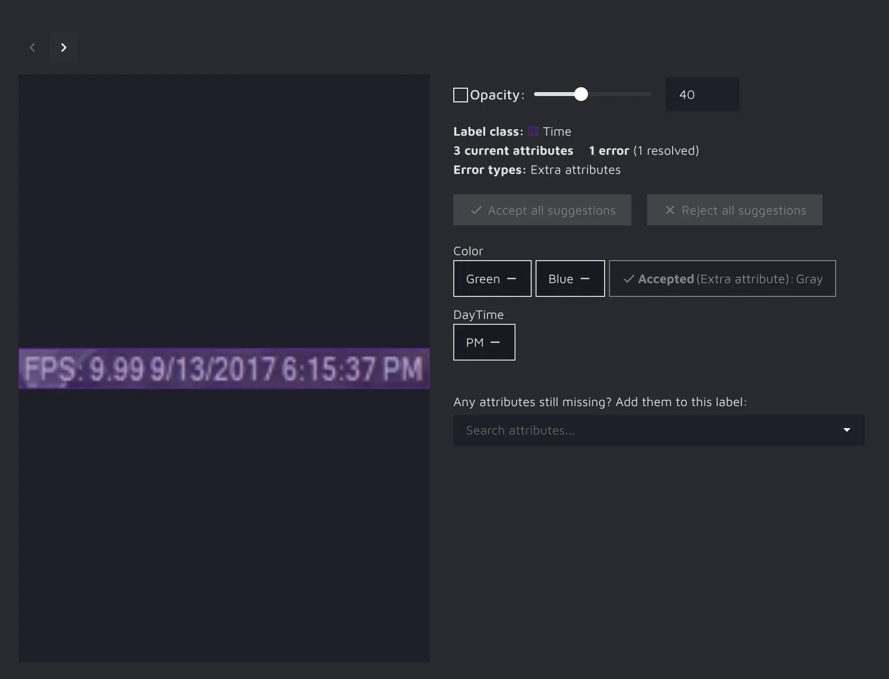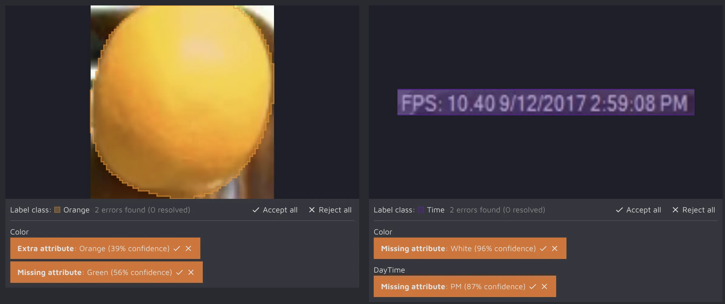 You can accept or reject all the suggestions in one click by clicking on the “Accept all” / “Reject all” options on the thumbnail card. Additionally, paying attention to the colors displayed after a user’s action might be worth it. The bright one means that the attribute was either added to the image or stayed the same, and the transparent one signalizes that after user action (could be both accept or reject depending on the type of error), the attribute was not added to the image;