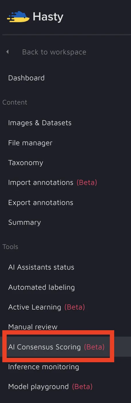 AI Consensus Scoring (AI CS) is one of Hasty’s key features offering an AI-powered Quality assurance solution. Some time ago, AI CS was available only in a separate environment. However, nowadays, it is also available directly from the Annotation Environment (AE). This is precisely what we are going to cover on this page.
